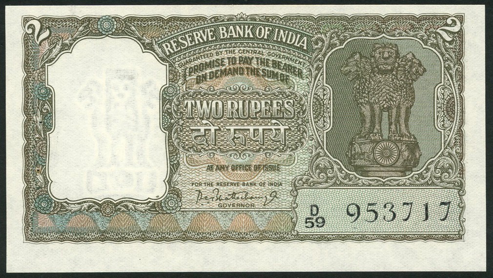 (x) Reserve Bank of India, 2 rupees (20), (1962-1967), olive green, Bhattacharyya signature and 2 rupees (26), pink-red, all Ashoka column at right, numeral 2 at centre