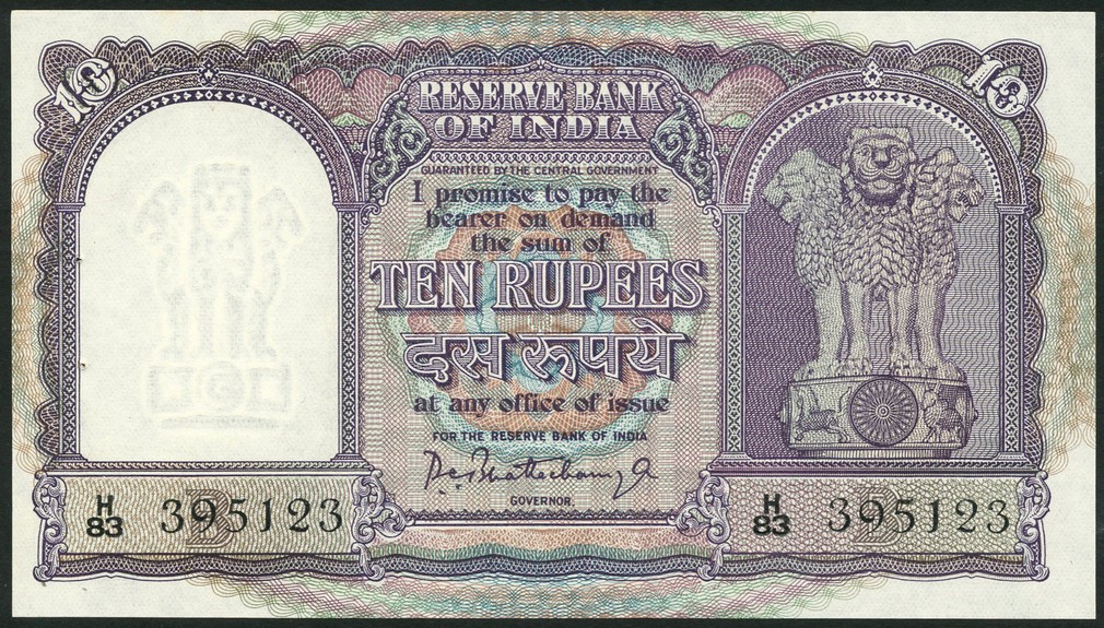 (x) Reserve Bank of India, 10 rupees (36), ND (1962-1967), prefix H/83, purple, Ashoka column at right, Bhattacharyya signature, B in underprint