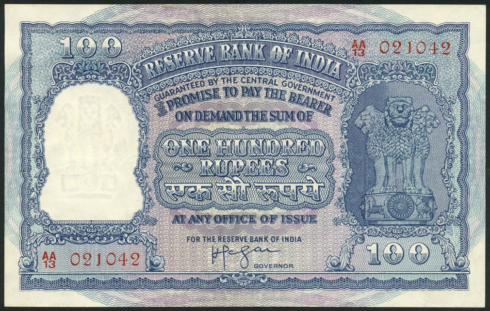 (x) Reserve Bank of India, 100 rupees, ND, red serial number AA/13 021042, blue on multicolour underprint, Ashoka column at right, reverse, two elephants at centre