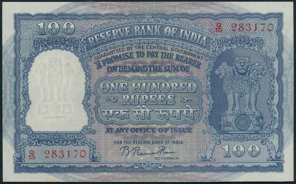 (x) Reserve Bank of India, 100 rupees (3), Madras, ND (1949-1957), red serial numbers Q/15 283164/165/170, blue and lilac, Ashoka column at right, Rama Rau signature