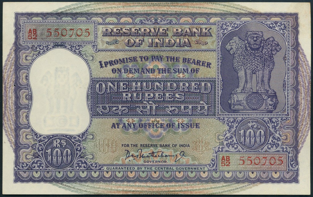 (x) Reserve Bank of India, 100 rupees (4), ND (1962-1967), all red prefix AB/52, violet and green, Ashoka column at right, Bhattacharya signature