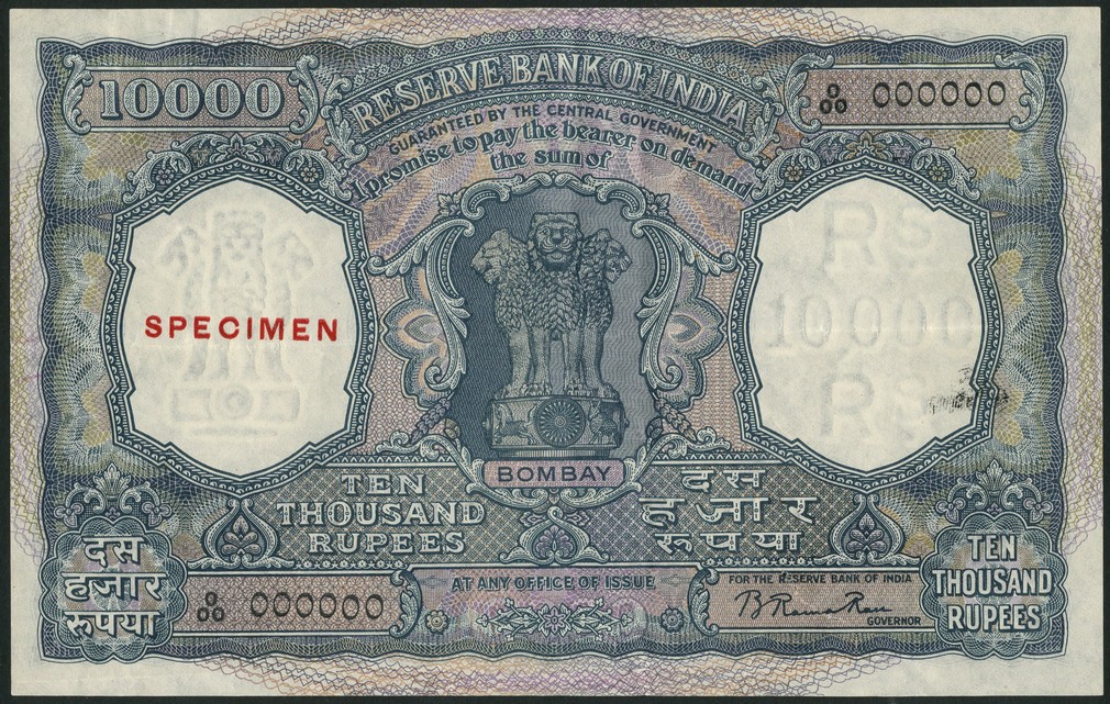 (x) Reserve Bank of India, specimen 10000 rupees, Bombay, ND (1954-), serial number 0/00 000000, blue and lilac, Ashoka column at centre, Rama Rau signature (signature 72), value at centre, top left and low right, reverse blue and lilac, text at centre, value at each corner, red stamp SPECIMEN at left