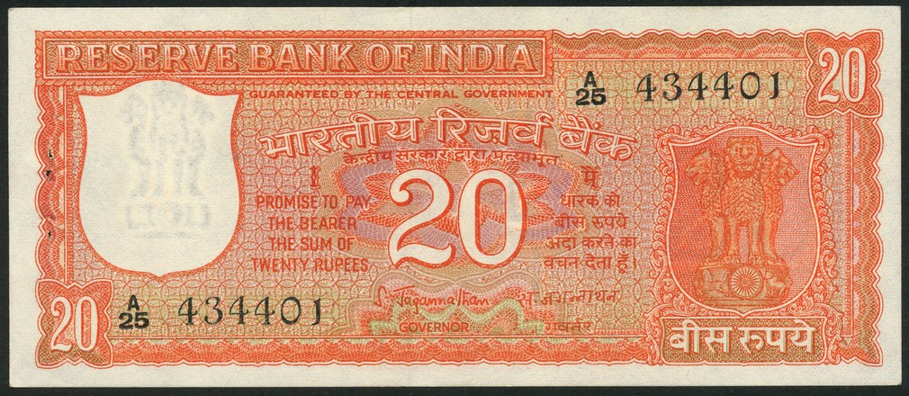 (x) Reserve Bank of India, 20 rupees (34), ND (1970), prefix A/25, red-orange, Ashoka column at right, Adarkar signature, corrected text on reverse