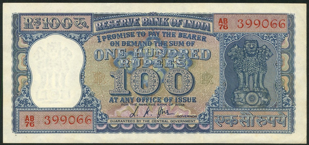 (x) Reserve Bank of India, 100 rupees (2), ND, red consecutive serial numbers AB76 399065/66 blue on multicolour underprint, Asoka column at right, reverse, dam at centre, arms low centre
