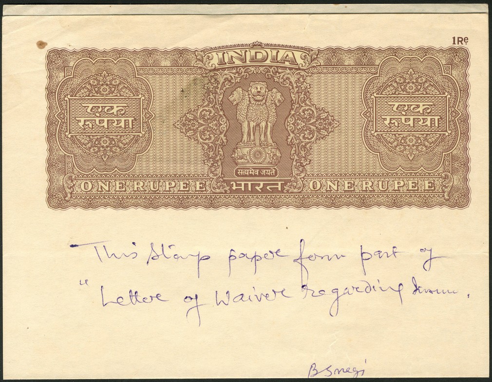 (x) Reserve Bank of India, 1000 rupees, ND (1975), prefix A/2, Bombay, purple, Ashoka column at right, Sengupta signature and a tax revenue stamp for one rupee, brown, large format, on watermark paper