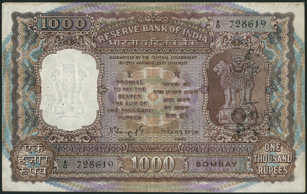 Reserve Bank of India, 1000 rupees, Bombay, ND (1975), serial number A/O 728619, purple, Ashoka column at right, Sengupta signature, reverse purple, temple at centre