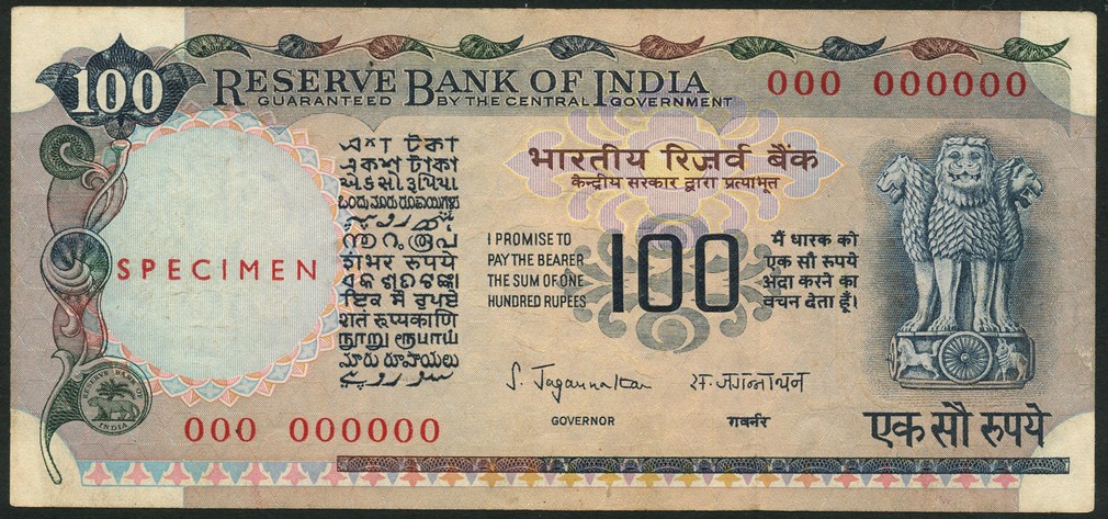 Reserve Bank of India, specimen 100 rupees, ND (1975), serial number 000 000000, black and dark purple on olive and multicolour underprint, Asoka column at right, red SPECIMEN overprint