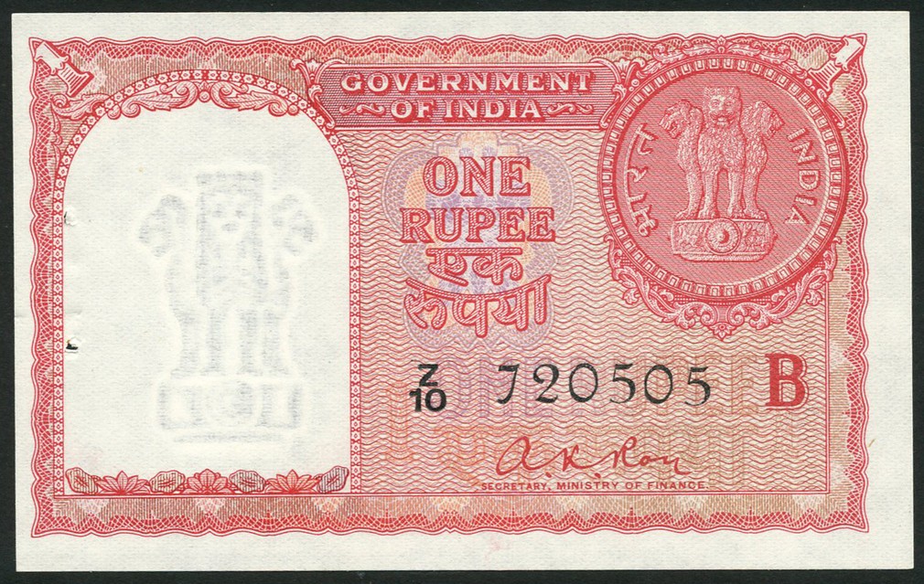 (x) India, Gulf rupee issue, 1 rupee, ND, serial number Z/10 720505, red and pale lilac, Asoka column at top right, A.K.Roy signature, B in right field, reverse red, 1 rupee coin top left
