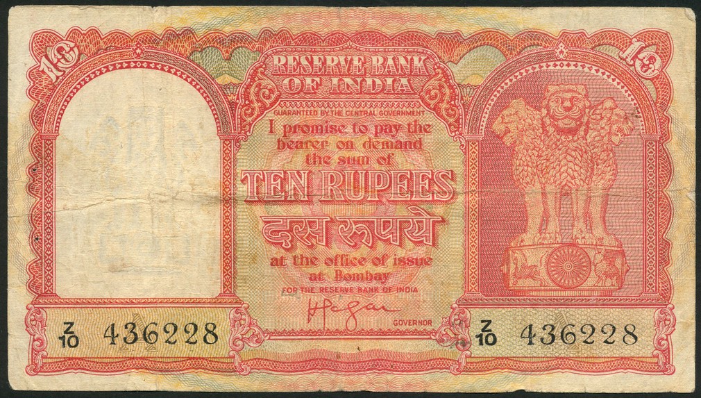 India, Gulf rupee issue, 1 rupee, 10 rupees (7), ND (1950's-), all Z prefix, red, Ashoka column at left, 1 rupee, red