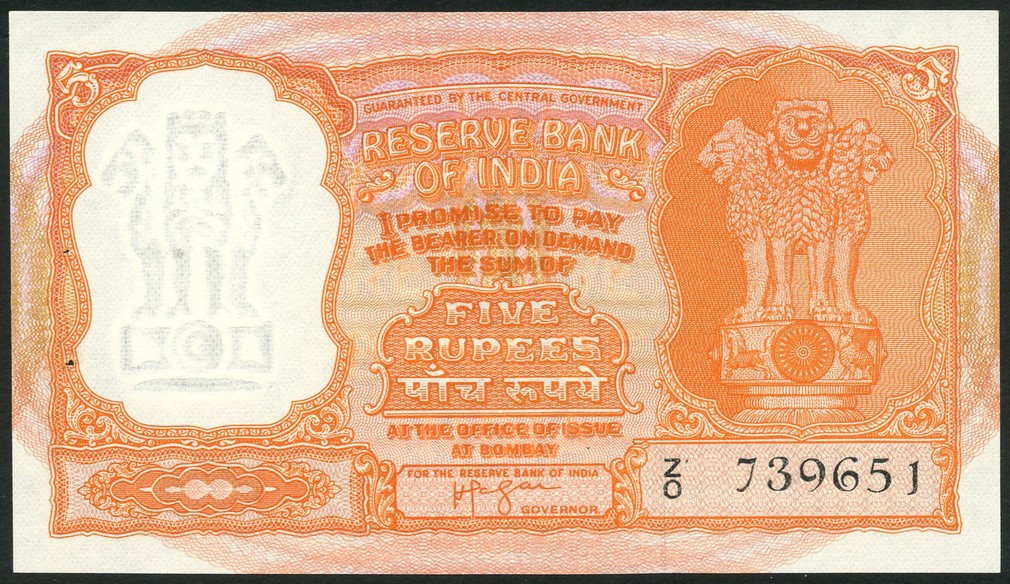 (x) India, Gulf rupee issue, 5 rupees, ND, serial number Z/O 739651, orange and pale lilac, Ashoka column at top right, Lengar signature, reverse orange and lilac, deer and value at left