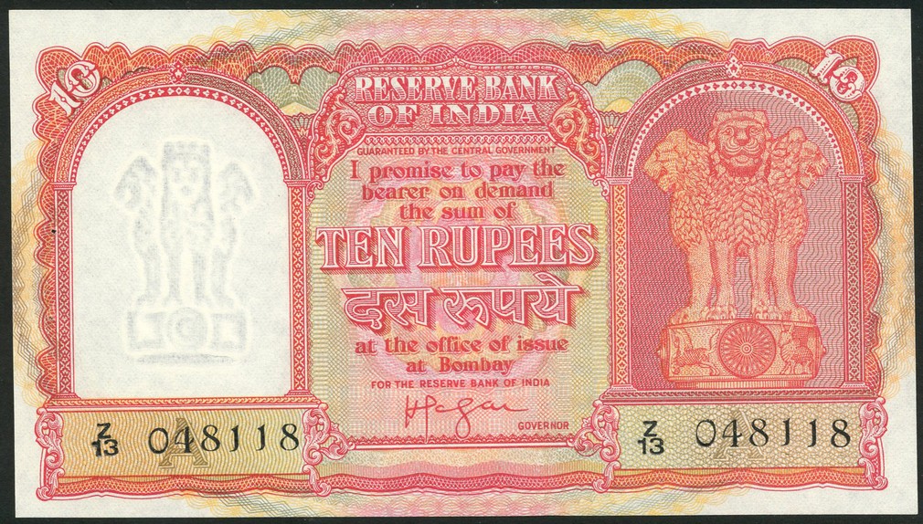 (x) India, Gulf rupee issue, 10 rupees, ND, serial number Z/13 048118, red and pale green, Ashoka column at right, Lengar signature, reverse red, dhow at centre, value top left and right