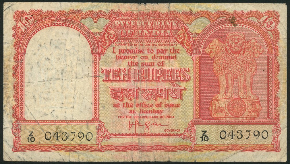 (x) Government/Reserve Bank of India, a varied group of generally more modern issues including 10 rupees, Deshmukh signature, 10 rupees (3), purple, Gulf issue 10 rupees, prefix Z/10, Ghandi 100 rupees, ND (2000), also Ceylon 1 rupee (2), 1941,1943, and Burma 10 rupees (2), green, George VI