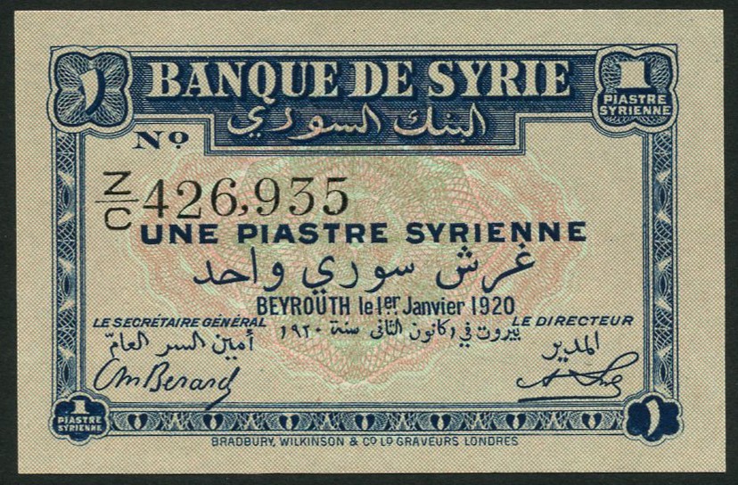 Banque de Syrie, 1 piastre (3), all dated 1 January 1920, serial numbers Z/A037,268, Z/B098,059 and Z/C426,935, dark blue on multicolour, bank title top centre, value in each corner and centre, reverse, ruins in central panel