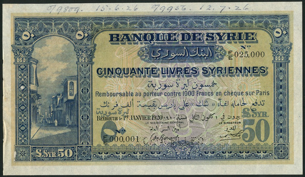 (†) Banque de Syrie, specimen 50 livres, 1 January 1920, serial number F/E 000001-F/E 025000, blue, pale green and lilac, street scene at left, value in field, reverse purple, green and mauve, feluccas at centre