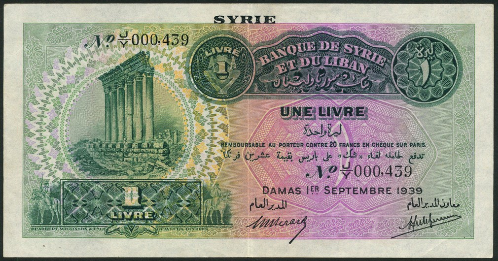 Banque de Syrie et du Liban, Lebanon & Syria, 1 livre, 1939, prefix S.71, blue and multicoloured, two eagles at centre, Berard and Laferriere signatures, reverse multicoloured, mountains and cedar tree, red LIBAN top left, also 1 livre, 1939, prefix J/Y, green and lilac, the pillars of Baalbek at left, black SYRIE in top margin, Berard and Laferriere signatures, reverse red and green and orange-brown