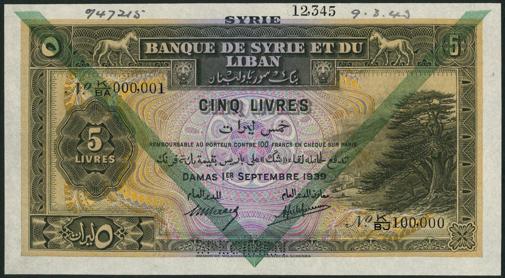 (†) Banque de Syrie et du Liban, Syria, specimen 5 livres, 1 September 1939, serial number K/BA 000001-K/BJ 100000, black, lilac and orange, cedar trees at right, value at left, SYRIE in top margin, green chevron overprint, reverse brown and pale green, view of city in oval at centre, green chevron overprint, value at left and right