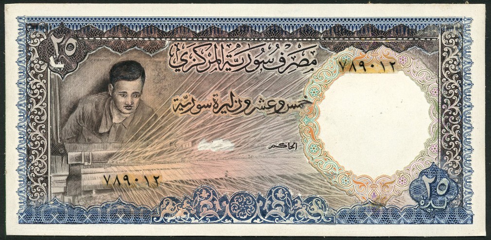 (†) Banque Centrale de Syrie, an obverse printers archival essay for a 25 pounds, ND (type of 1966), blue and multicoloured, man and loom at left