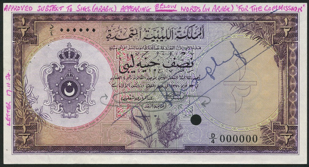 (†) United Kingdom of Libya, specimen 1/2 pound, AH 1371 (1951), serial number D/4 000000, purple on multicolour underprint, arms at left, palm tree at right, value at each corner, cancellation hole and ink text, signatures of Shagluf and Muntaser