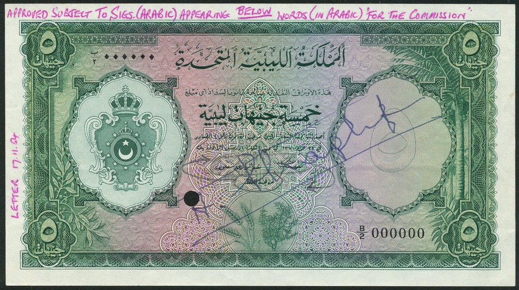 (†) United Kingdom of Libya, specimen 5 pounds, AH 1371 (1951), serial number B/2 000000, green on multicolour underprint, arms at left, palm tree at right, value at each corner, cancellation hole and ink text, signatures of Shagluf and Muntaser