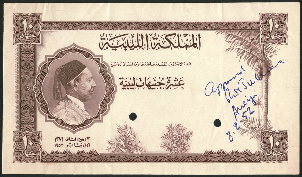 (†) Kingdom of Libya, a uniface obverse die proof for a 10 pounds, AH1371 (1952), brown, King Idris at left, palm tree at right, bushes at low centre, value at each corner, two cancellation holes