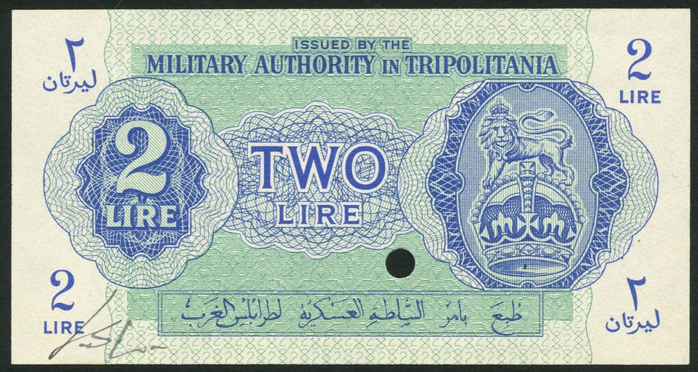 (†) Military Authority in Tripolitania, specimen 1 and 2 lire, ND (1943), first green, second blue and green, arms and values on face, values on reverse, each with one cancellation hole