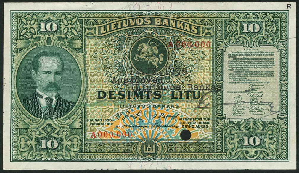 (†) Lietuvos Bankas, Lithuania, specimen 10 litu, 16 February 1938, serial number A000000, green on multicolour underprint, Antanas Smetona at left, Saint George at top centre, value at each corner, reverse green, Council of Lithuania at centre, value at each corner, one cancellation hole, handsigned on obverse and reverse and printed with 'Approved' text on reverse