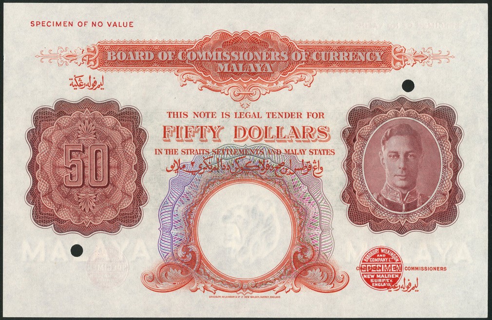 (†) Board of Commissioners of Currency, Malaya, specimen colour trial $50, ND (1942), no serial numbers, no signatures, brownish purple, red and multicoloured, portrait of King George VI at right, value in guilloche at left, reverse olive-green, arms of the states and value set in ornate guilloches, overprinted SPECIMEN OF NO VALUE in red with red Bradbury Wilkinson seal on obverse and reverse, two punch holes