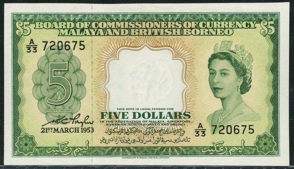 (x) Board of Commissioners of Currency, Malaya and British Borneo, $5, 21 March 1953, serial number A/33 720675, green on multicolour underprint, Elizabeth II at right, value at left and top corners, reverse green, multiple arms