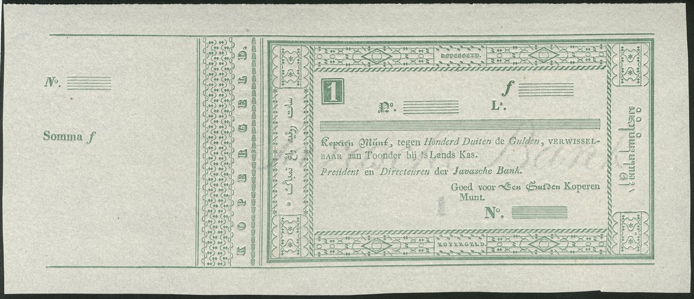 Netherlands East Indies, remainder 1 gulden Kopergeld issue, ND (1832), no serial number, green on pale cream paper, no signatures, counterfoil, Javasche Bank watermark