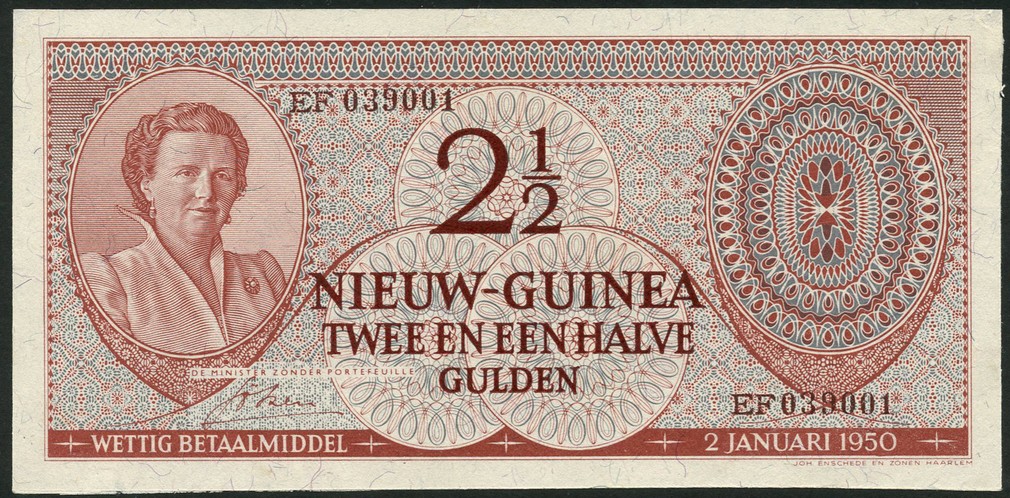 Netherlands New Guinea, 2 1/2 gulden, 2 January 1950, serial number EF039001, reddish brown on multicolour, portrait Queen Juliana at left, denomination at centre, reverse reddish brown patterned on blue underprint, denomination at each corner
