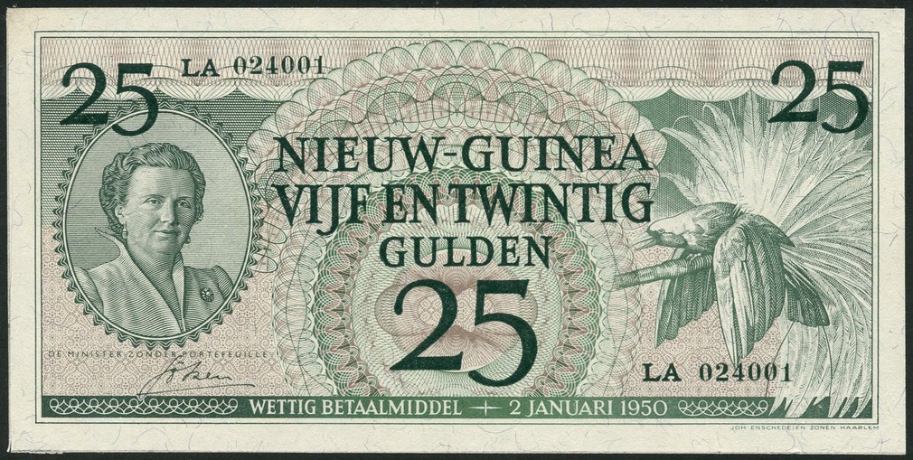 Netherlands New Guinea, 25 gulden, 2 January 1950, serial number LA 024001, green on lilac underprint, portrait Queen Juliana at left, greater bird of paradise at left, reverse, green and lilac, denomination at each corner, ornate pattern