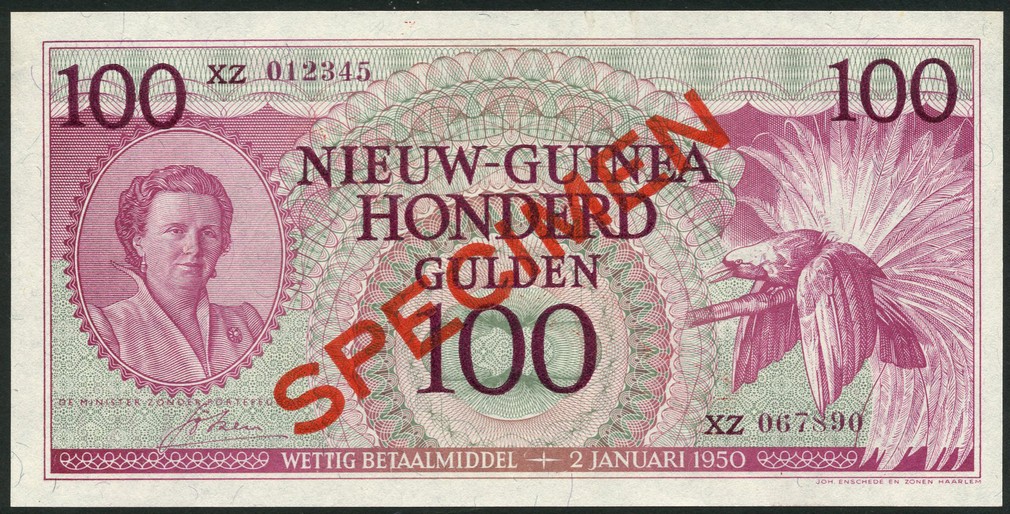 Netherlands New Guinea, specimen 100 gulden, 2 January 1950, serial number XZ067890, pink and light turquoise, portrait Queen Juliana at left, greater bird of paradise at left, diagonal red SPECIMEN overprint, reverse, ornate pattern, denomination in each corner, diagonal red SPECIMEN overprint