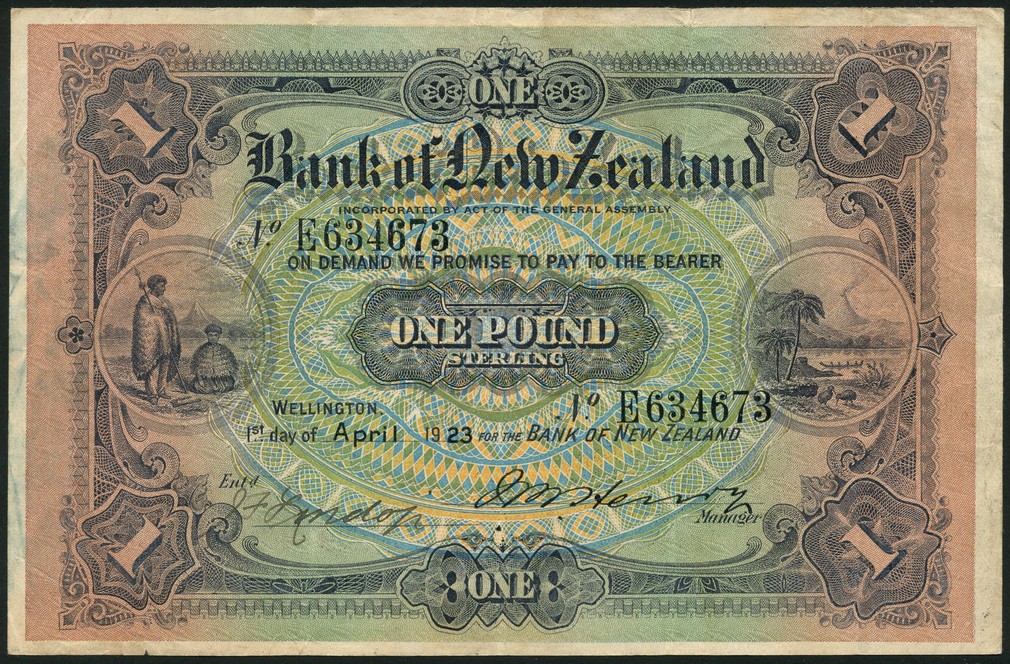 (x) Bank of New Zealand, £1, Wellington, 1 April 1923, serial number E 634673, pink, green and purple, Maoris at left, landscape at right, value at centre and at each corner, one printed and one manuscript signature below, reverse purple and green, arms at centre