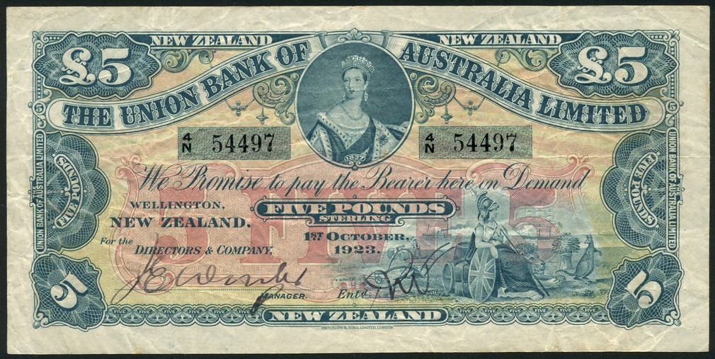 (x) Union Bank of Australia, New Zealand, £5, 1 October 1923, serial number 4N 54497, blue and pink, portrait Queen Victoria top centre, seated Britannia and symbols of commerce low right, reverse, grey blue, value at each corner and at centre