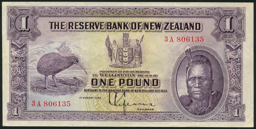 (x) Reserve Bank of New Zealand, £1, Wellington, 1 August 1934, red serial number 3A 806135, purple, the Maori King Tawhiao at right, Kiwi bird at left, arms top centre, printed signature of Lefeaux, purple and pale green, Milford Sound at centre, value at left and right