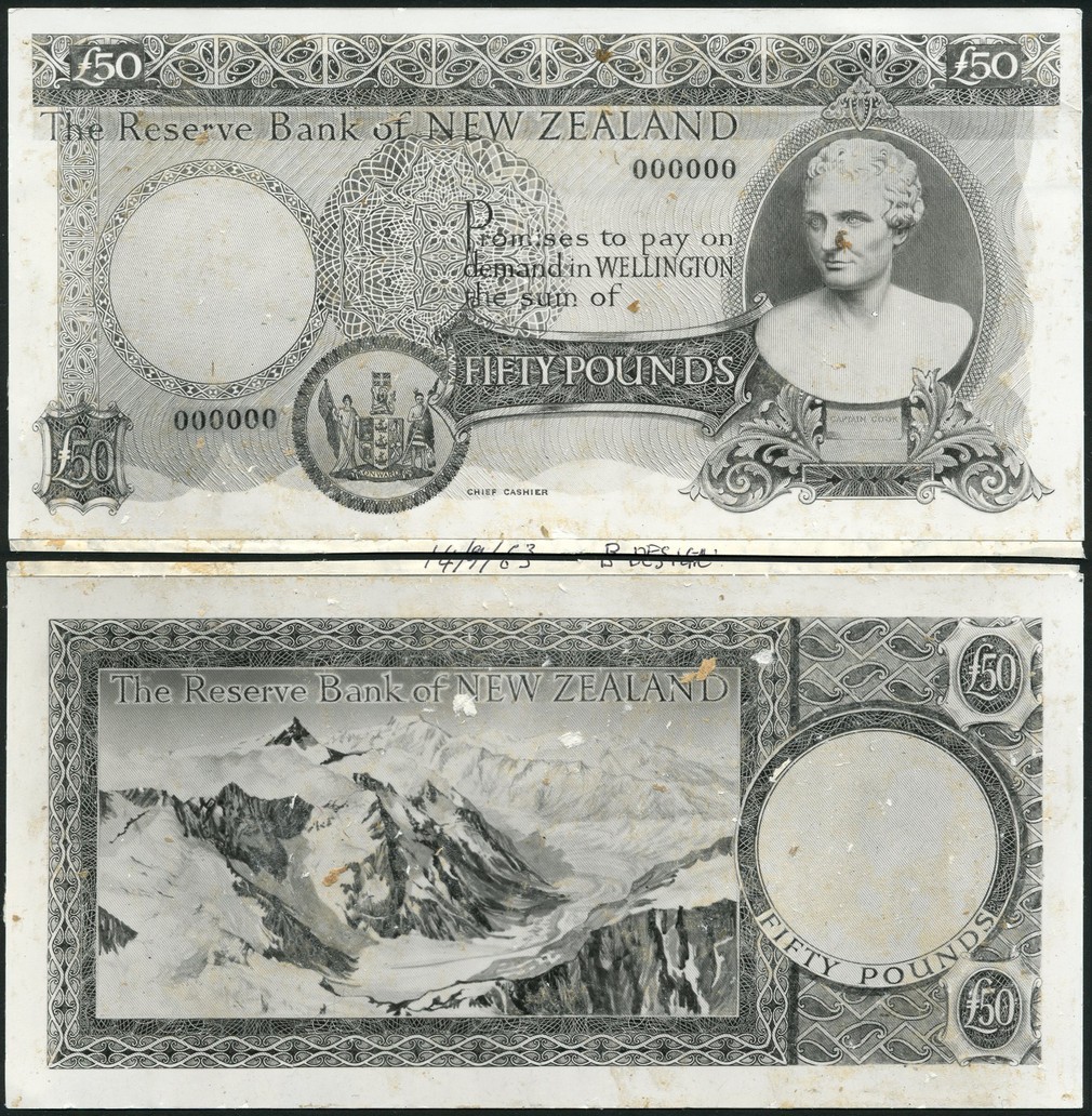 Reserve Bank of New Zealand, a printers archival obverse and reverse photograph for a proposed issue of £50, ND (1963), zero serial numbers, black and white, an unusual portrait of Captain Cook at right, arms low left, reverse mountains