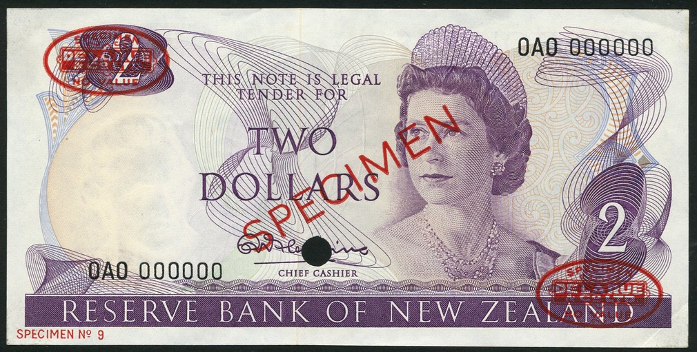 (†) Reserve Bank of New Zealand, specimen $1, ND (1967), serial number OA 000000, brown on multicoloured underprint, Queen Elizabeth II at right, reverse fantail; and specimen $2, ND (1967), serial number OAO 000000, purple on multicoloured underprint, Queen Elizabeth II at right, reverse rifleman, both Fleming signature, both overprinted SPECIMEN in red with two De La Rue specimen ovals on obverse and reverse and SPECIMEN No 9 in lower left margins, one punch hole