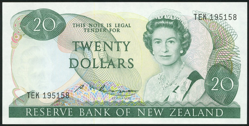 (x) Reserve Bank of New Zealand, $1, brown, $2, violet, $5, red, $10, blue and $20, green, all ND (1985), all Elizabeth II at right, Russell signature