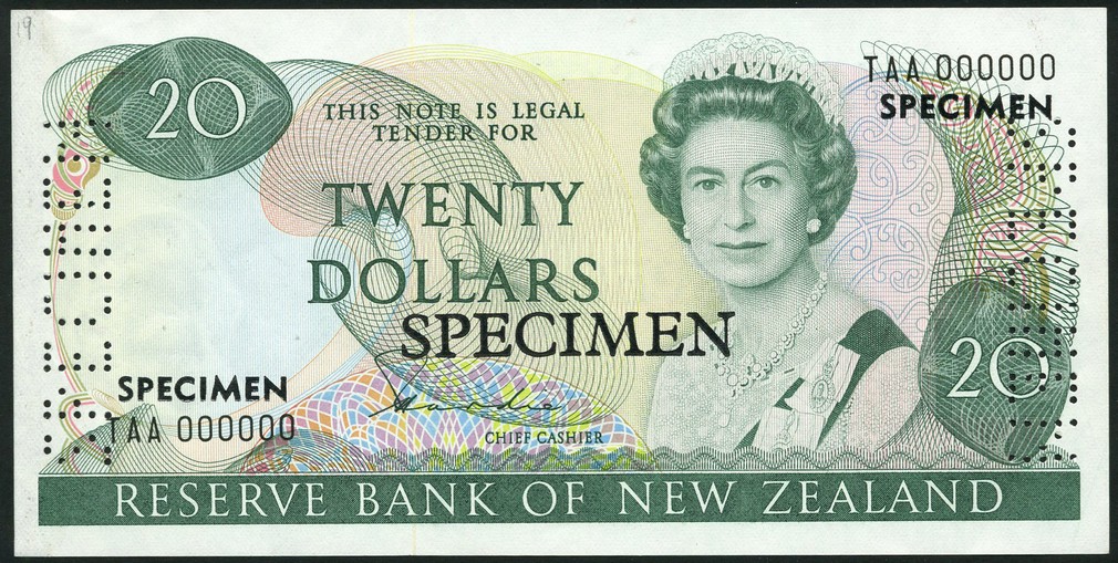 (†) Reserve Bank of New Zealand, specimen $20, ND (1981), serial number TAA 000000, signature, Hardie, green on multicoloured underprint, mature portrait of Queen Elizabeth II at right, reverse miro and pigeon, overprinted SPECIMEN in black three times on obverse and once on reverse, perforated SPECIMEN twice