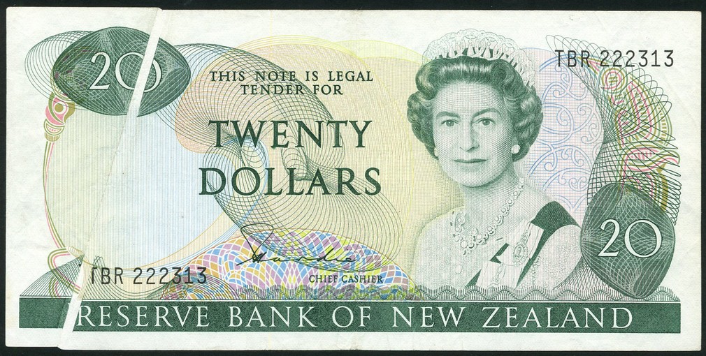 (x) ERROR: Reserve Bank of New Zealand, $20, ND (1981-85), serial number TBR 222313, green on multicolour underprint, Elizabeth II at right, fold in the paper during printing and cutting resulting in white line of paper at left