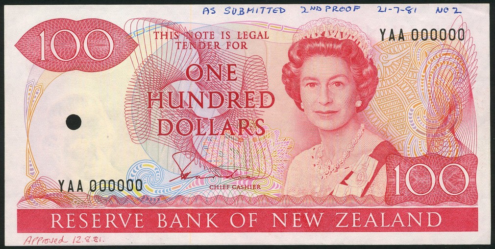 (†) Reserve Bank of New Zealand, specimen proof $100, ND (1981), serial number YAA 000000, signature Hardie, red on multicoloured underprint, mature portrait of Queen Elizabeth II at right, reverse mountain daisy and takahe, one punch hole