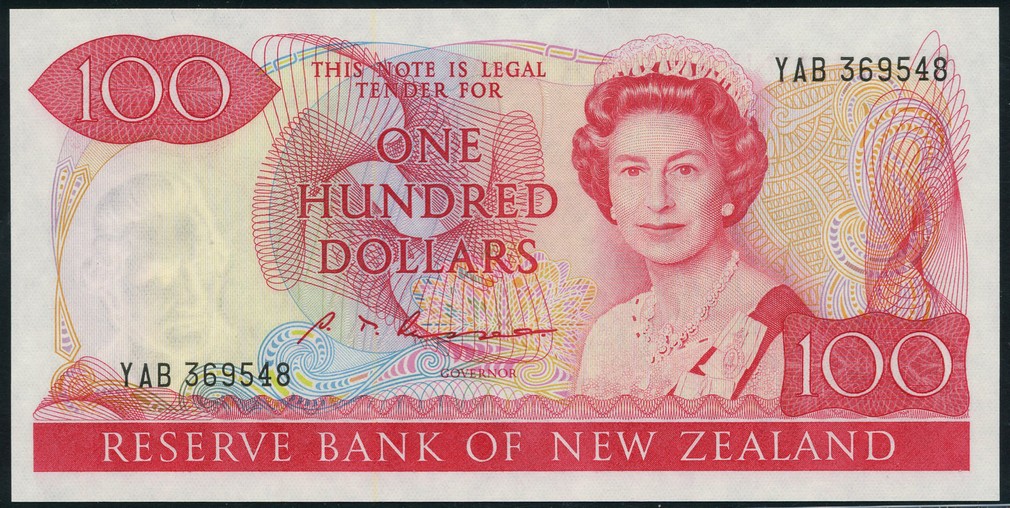 (x) Reserve Bank of New Zealand, $100, ND (1985), serial number YAB 369548, red and multicoloured, Elizabeth II at right, Russell signature, reverse red, Takahe bird at centre