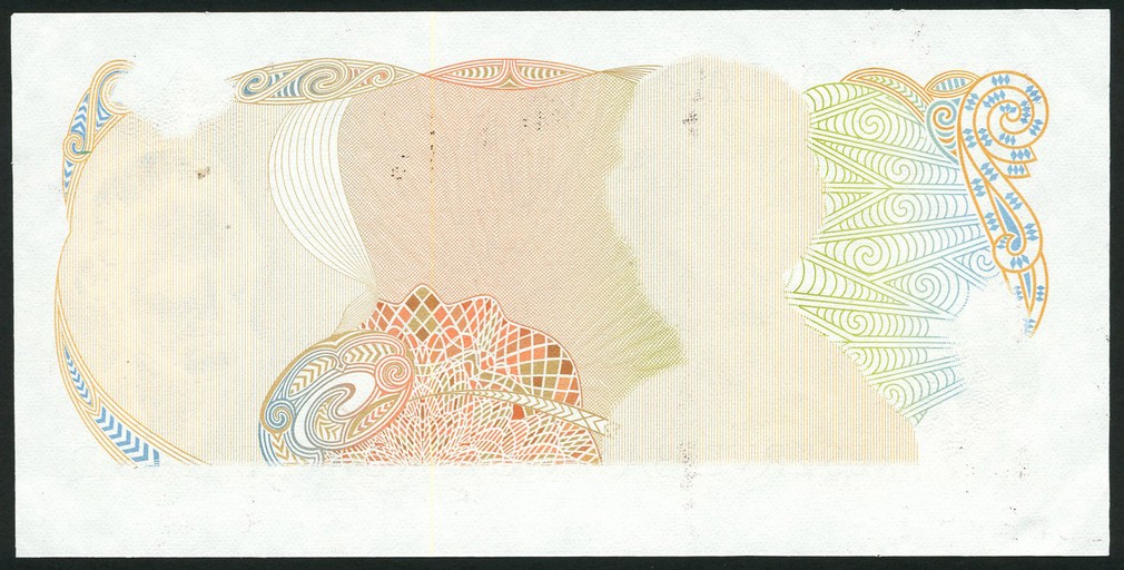 Reserve Bank of New Zealand, proof $1, ND (1981), brown on multicoloured underprint, portrait of Queen Elizabeth II, value tablets and script omitted from obverse, reverse complete with clematis at left and fantail at centre