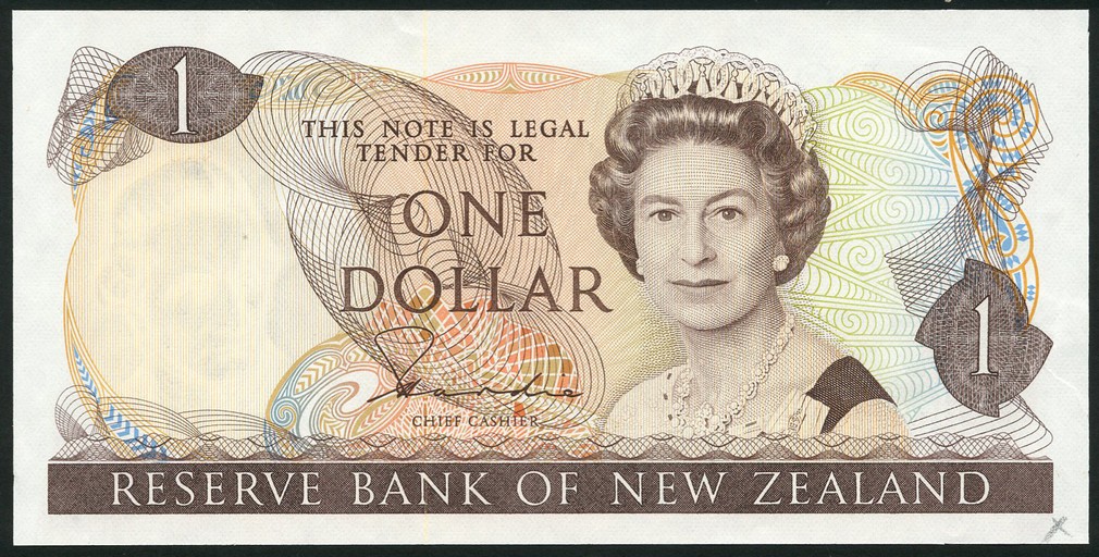 Reserve Bank of New Zealand, $1, ND (1981), no serial numbers, signature H. R. Hardie, brown on multicoloured underprint, mature portrait of Queen Elizabeth II at right, reverse clematis at left, fantail at centre