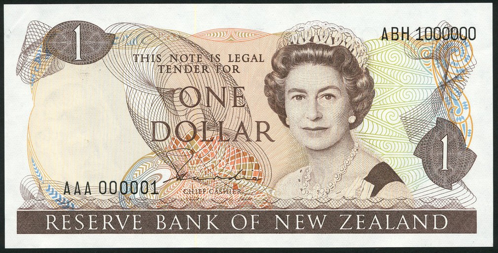 Reserve Bank of New Zealand, printer's archival specimen $1, ND (1981), serial number run AAA 000001 to ABH 1000000, signature H. R. Hardie, brown on multicoloured underprint, mature portrait of Queen Elizabeth II at right, reverse clematis at left, fantail at centre