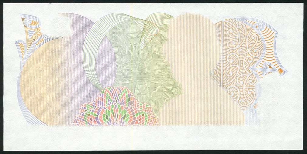 Reserve Bank of New Zealand, proof $2, ND (1981), purple on multicoloured underprint, portrait of Queen Elizabeth II, value tablets and script omitted from obverse, reverse complete with mistletoe at left and rifleman at centre