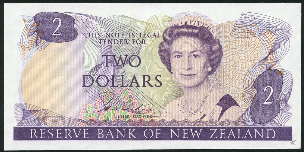 Reserve Bank of New Zealand, $2, ND (1981), no serial numbers, signature H. R. Hardie, purple on multicoloured underprint, mature portrait of Queen Elizabeth II at right, reverse mistletoe at left, rifleman at right