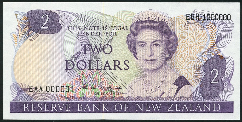 Reserve Bank of New Zealand, printer's archival specimen $2, ND (1981), serial number run EAA 000001 to EBH 1000000, signature H. R. Hardie, purple on multicoloured underprint, mature portrait of Queen Elizabeth II at right, reverse mistletoe at left, rifleman at centre