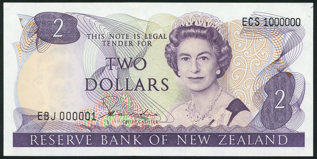 Reserve Bank of New Zealand, printer's archival specimen $2, ND (1981), serial number run EBJ 000001 to ECS 1000000, signature H. R. Hardie, purple on multicoloured underprint, mature portrait of Queen Elizabeth II at right, reverse mistletoe at left, rifleman at centre