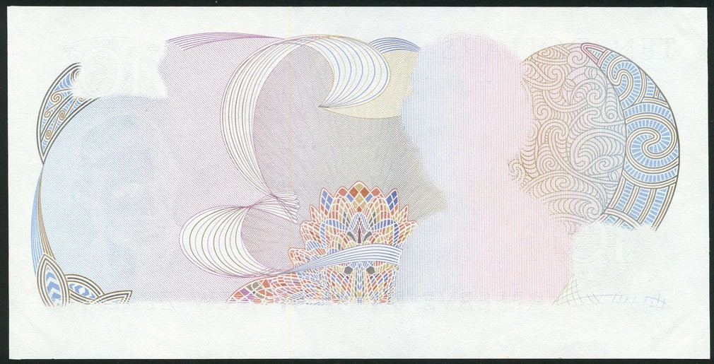 Reserve Bank of New Zealand, proof $10, ND (1981), blue on multicoloured underprint, portrait of Queen Elizabeth II, value tablets and script omitted from obverse, reverse complete with mountain lily at left and kea at centre
